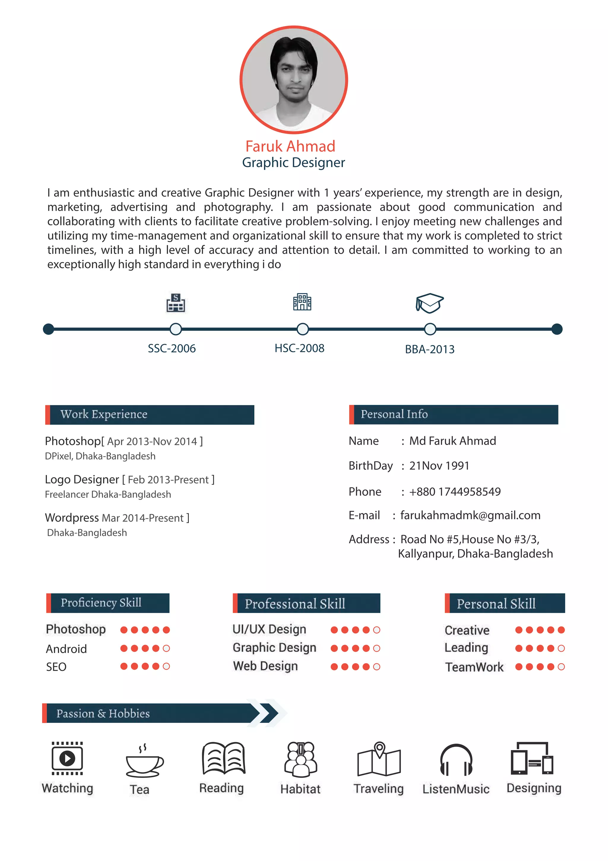 Faruk Ahmad is an enthusiastic and creative graphic designer with 1 year of experience in design, marketing, advertising, and photography. He enjoys collaborating with clients to solve creative problems and meeting new challenges by utilizing his time management and organizational skills to ensure his work is completed on time and to a high standard. Faruk Ahmad has a BBA from 2013 and experience as a logo designer, Photoshop user, and WordPress developer.