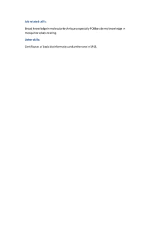 Tahani Alyas is applying for an MSF job. She has worked as a research assistant at the Tropical Medicine Research Institute in Sudan from 2007 to present, first as a research assistant from 2007-2011 and then as a researcher from 2011-present. She has training in tropical disease vectors, transmission patterns, and principles of diagnosis including serological and molecular techniques. Her skills include Arabic and English language abilities, communication skills from working on various projects, organizational and managerial experience from her roles in her department and projects, as well as job related skills in PCR and mosquito rearing. She also has certificates in bioinformatics and SPSS.