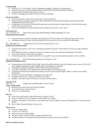 Daniel O'Keeffe is currently pursuing a PhD in electrical engineering at University College Cork in Ireland, funded through an Irish Research Council scholarship. His PhD focuses on cooperative control of DC microgrids using low bandwidth communications. He previously completed his undergraduate degree at UCC, achieving a first class honors in electrical and electronic engineering. He has work experience in research engineering and design/evaluation roles, and technical skills in programming, modeling, and electronics.