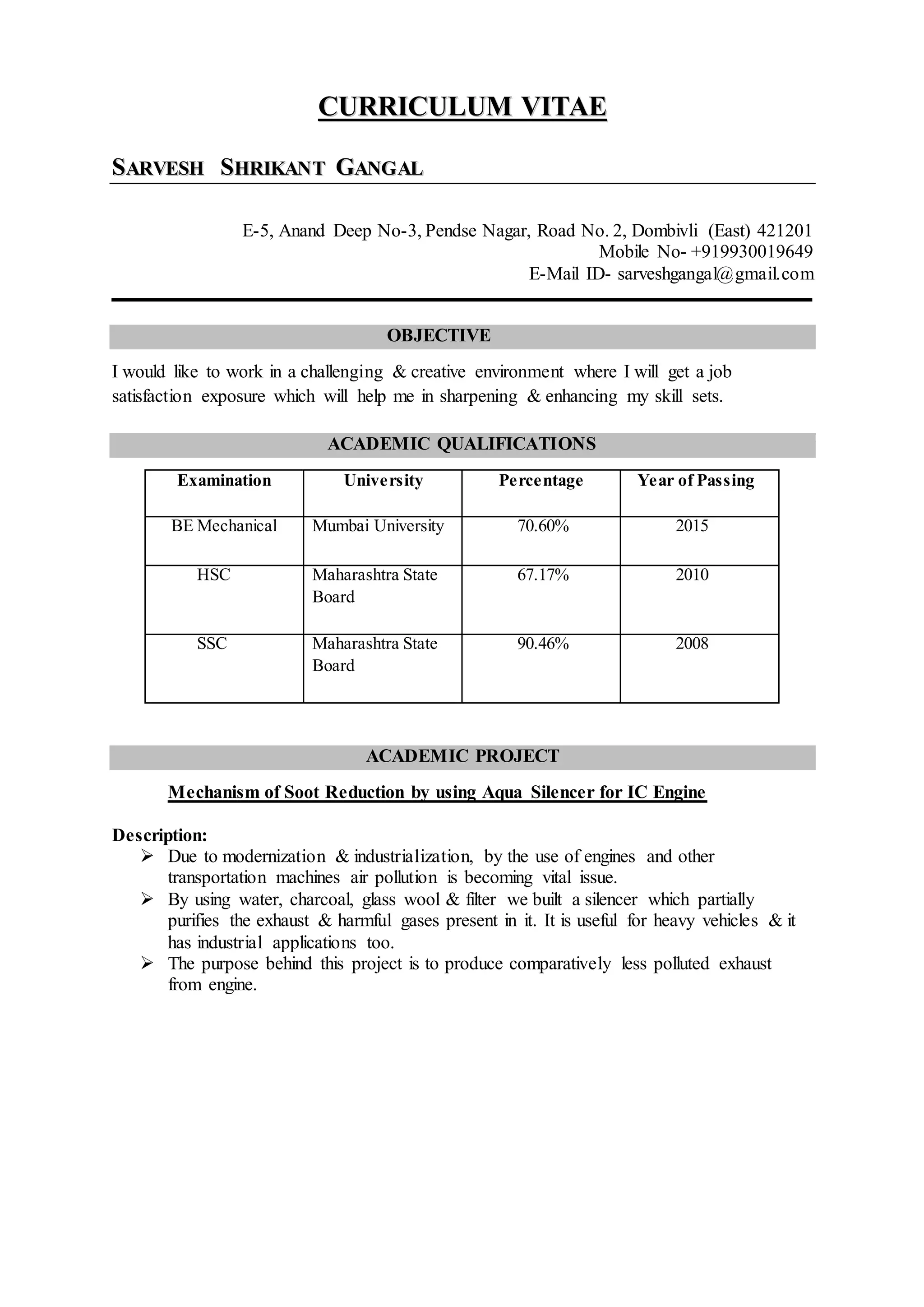 Sarvesh Gangal seeks a challenging and creative job where he can enhance his skills. He has a BE in Mechanical Engineering. As a student, he completed projects on reducing engine emissions and worked on robotics. He held leadership roles like event head for tech fests and was editor of his department's magazine. His skills include CAD, programming, and Microsoft Office.