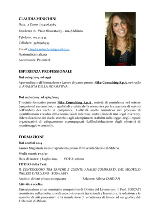 Claudia Minichini, nata a Como nel 1989, è un'analista della normativa con esperienza professionale in Nike Consulting S.p.A. e una laurea magistrale in giurisprudenza. Ha partecipato a un programma Erasmus in Grecia e possiede buone competenze in inglese e informatica. È interessata al volontariato e pratica sport come il rugby.