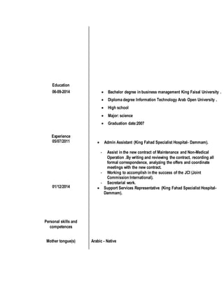 Haya Khaled Al Dossary، مواطنة سعودية، ولدت في 16 أغسطس 1989، تحمل درجة بكاليوس في إدارة الأعمال ودبلوم في تكنولوجيا المعلومات. لديها خبرة عمل تتضمن العمل كمسؤولة مساعدة إدارية والمشاركة في منظمات تطوعية مثل أرامكو. تتمتع بمهارات في استخدام برامج Microsoft Office ولها طموحات لتكون عنصر فعال في المجتمع.