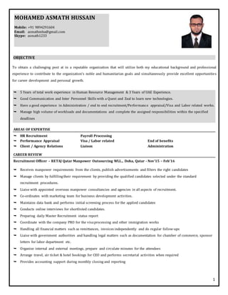 The document is a resume for Mohamed Asmath Hussain seeking a position in human resources. It summarizes his 5 years of experience in HR management, recruitment, payroll processing, and administration. His most recent role was as a recruitment officer in Qatar where he fulfilled staffing requirements, conducted interviews, and managed visa processing. He is proficient in all Microsoft Office applications and seeks a challenging HR role that allows for career growth.
