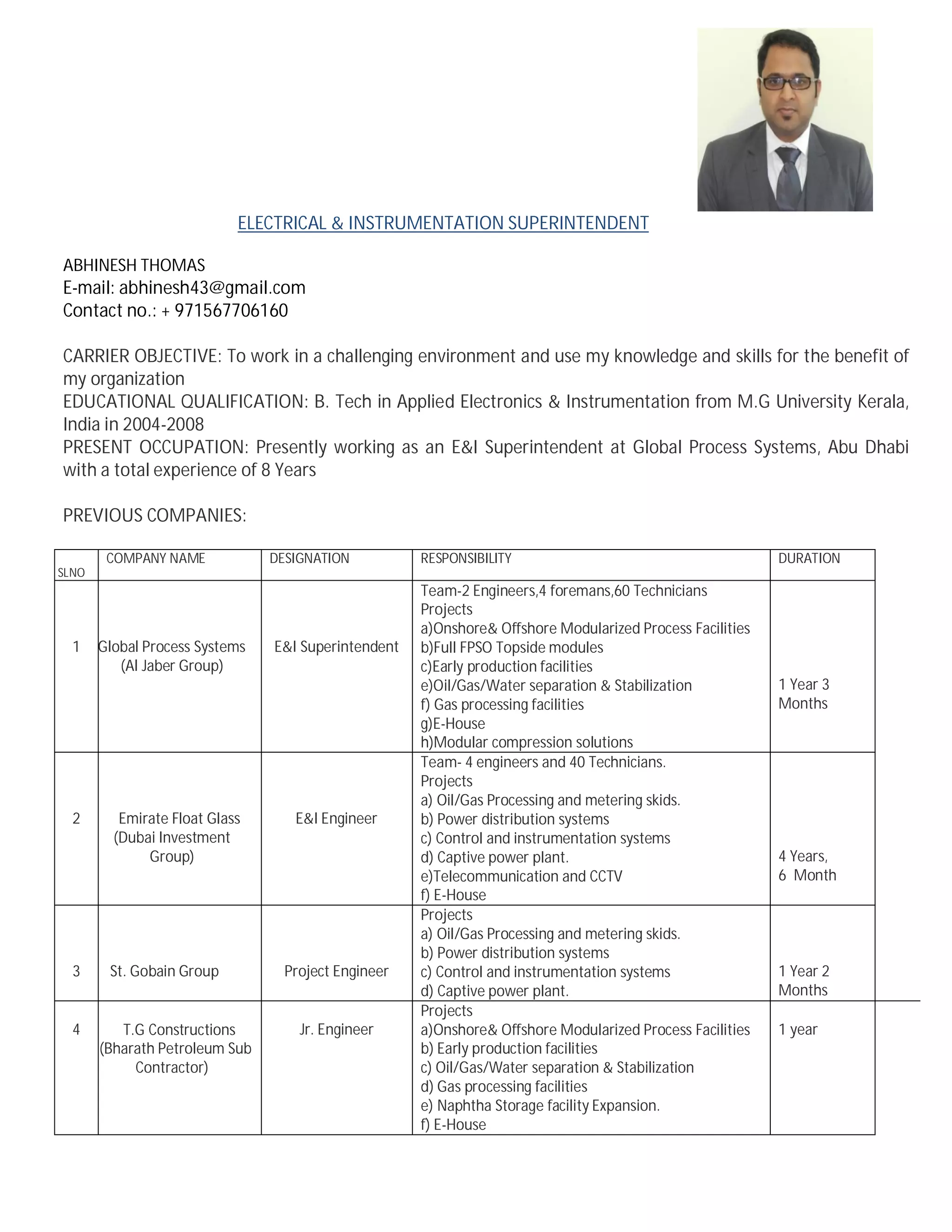 Abhinesh Thomas is an Electrical and Instrumentation Superintendent with over 8 years of experience. He holds a B.Tech in Applied Electronics and Instrumentation. He is currently working at Global Process Systems in Abu Dhabi, where he supervises a team of engineers, foremen, and technicians. Previously he has worked on projects involving oil and gas processing, power distribution systems, control systems, and more. He has extensive experience in project installation, commissioning, engineering, and maintenance.