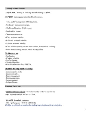 This CV summarizes Amr Mohamed Rashad's qualifications for a position with Sakr FMCG group. He holds a Master's degree in human development and diploma in international arbitration. He is fluent in English and Arabic with strong computer skills. His previous experience includes quality assurance roles at Pharco, Elnasr, PepsiCo where he received awards, and his current role as Quality Manager at Sakr FMCG group's glass and concentrate factories. He has extensive training in quality management systems, food safety, and workplace safety.