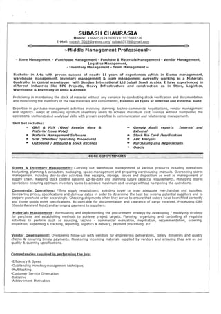This document provides a summary of Subash Chaurasia's work experience and qualifications. It includes 11 years of experience in store management, warehouse management, inventory management, and team management. Currently working as a Materials Controller in Saudi Arabia, responsibilities include maintaining stock levels, inventory management, purchase management, and vendor management. Previous roles include Store Keeper positions in India with responsibilities such as day-to-day store operations, inventory control, materials receiving and issuing, and monthly reporting. Educational background includes a Bachelor's degree in Arts from India.