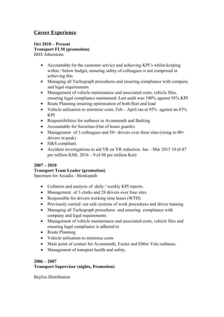 Michael Daly has over 15 years of experience in the transport and logistics industry, holding various roles including Transport Team Leader, Transport Supervisor, and currently Transport FLM at BHS Atherstone. He has strong communication, leadership, and problem solving skills. Daly is proficient in Microsoft Office applications and transport management systems. He holds several qualifications in transport and adult education.