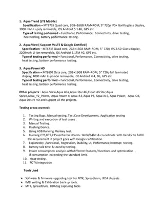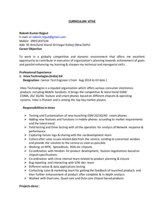 This document is a curriculum vitae for Rakesh Kumar Rajput that summarizes his professional experience and qualifications. It details his current role as a Senior Test Engineer at Intex Technologies, where he tests and customizes new mobile phones. It also outlines a previous role at ZTE Telecom India as a Senior Engineer testing and troubleshooting mobile phones and network equipment. Rakesh holds a Bachelor's degree in Electronics and Communication Engineering and has over 15 years of experience in testing, customizing, and troubleshooting mobile phones and network devices.