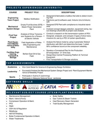 This document is a resume for Muhammad Luqman Bin Rosli. It summarizes his work experience, education, skills, and qualifications. He has a BSc in Mechanical Engineering and a diploma in helicopter maintenance. For work experience, he has participated in helicopter modifications and maintenance. He also has internship experience in asset management and as a steam plant engineer. His skills include interpreting technical drawings, updating asset data, and assisting engineers. He is proficient in English and Malay and has experience with software like Arduino and AutoCAD.