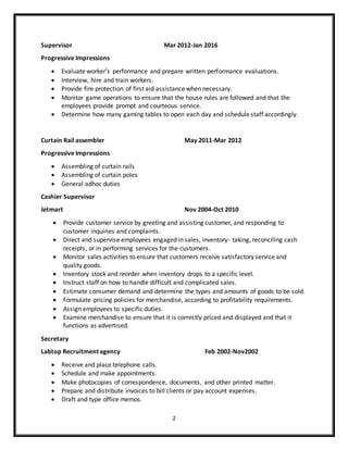 This document is a resume for Lungiswa Innocentia Masopye summarizing her professional experience. She has over 3 years of experience as a supervisor in a production company and 6 years of experience in sales and customer service. Her resume lists her roles as a sales consultant, supervisor, cashier supervisor, secretary, and her education including certificates in management, human resources, and secretarial skills.