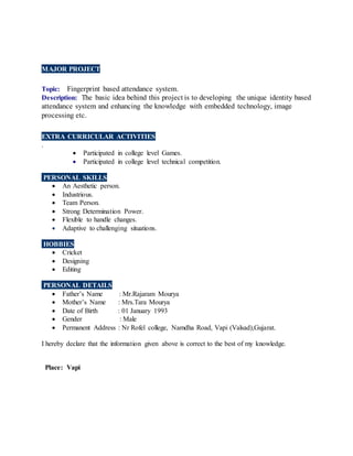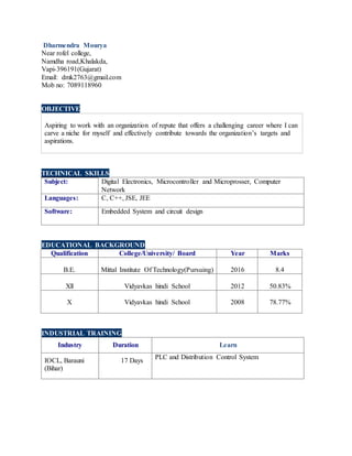 Dharmendra Mourya is seeking a challenging career where he can effectively contribute towards organizational targets. He has technical skills in digital electronics, microcontrollers, and computer networks. He has knowledge of programming languages like C, C++, Java, and software like embedded systems and circuit design. He has a Bachelor of Engineering degree from Mittal Institute of Technology and participated in industrial training at IOCL on PLC and distribution control systems. His major project was developing a fingerprint-based attendance system using embedded technology and image processing.