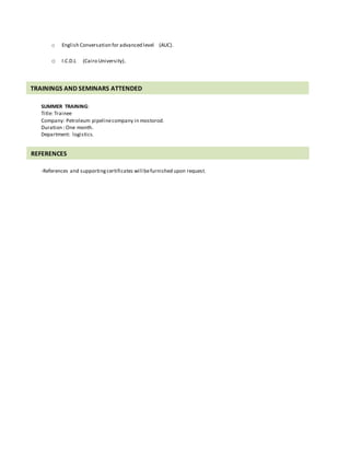 Mostafa Mohamed Hassan Khodary is a 22-year-old single Egyptian male who recently graduated from Cairo University with a degree in Business Administration. He is seeking a full-time position in a reputable company where he can utilize and develop his skills. Mostafa has proficiency in English and Microsoft Office applications. He has also attended seminars in areas like human resources management.