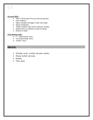 This document is a CV for Robert Moress Boshra. It provides his personal details like date of birth, address, education history including graduating from Cairo University in 2017 with a degree in information technology. His work experience and training section states he has no prior experience. For skills, he lists proficiency with various computer programs and operating systems as well as English language abilities. His interests include watching movies, sports, running and video games.