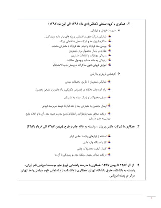 ﮔﺮوه)ديﻣﺎه1391اﻟﯽآﺑﺎنﻣﺎه1393( ﺑﺎزارﯾﺎﺑﯽ و ﻓﺮوش ﺳﺮﭘﺮﺳﺖ ،ﺳﺎﺧﺘﻤﺎﻧﯽ ﻫﺎي ﺷﺮﮐﺖ ﺷﻨﺎﺳﺎﯾﯽﻫﺎي ﭘﺮوژهﺑﺮﺗﺮﺳﺎرﯾﻨﺎﮐﯿﺶ ﻣﺎﻧﻨﺪ ﺑﺰرگ ﺳﺎﺧﺘﻤﺎﻧﯽ ﻫﺎي ﺷﺮﮐﺖ و ﻫﺎ ﭘﺮوژه ﺑﺎ ﻣﺬاﮐﺮه اﻧﺠﺎم و ﻗﺮارداد ﻣﻔﺎد ﺑﺮرﺳﯽﻗﺮارداد ﻋﻘﺪﻣﻨﺘﺨﺐ ﻣﺸﺘﺮﯾﺎن ﺑﺎ ارﺳﺎل ﺑﺮ ﻧﻈﺎرتﻣﺸﺘﺮﯾﺎن ﺑﺮاي ﻣﺤﺼﻮل ﺑﻬ رﺳﯿﺪﮔﯽو ﻨﻈﺮاتاﻧﺘﻘﺎداتﻣﺸﺘﺮﯾﺎن ﻣﻄﺎﻟﺒﺎت وﺻﻮل و ﺣﺴﺎب ﻣﺎﻧﺪه ﺑﻪ رﺳﯿﺪﮔﯽ آﻣﻮزشﻣﺬاﮐﺮات ﻓﻨﻮن ،ﻓﺮوشاﻻﺳﺘﺨﺪام ﺟﺪﯾﺪ ﭘﺮﺳﻨﻞ ﺑﻪ ﺑﺎزارﯾﺎﺑﯽ و ﻓﺮوش ﮐﺎرﺷﻨﺎس ﻃﺮﯾﻖ از ﻣﺸﺘﺮﯾﺎن ﺷﻨﺎﺳﺎﯾﯽﺗﺤﻘﯿﻘﺎتﻣﯿﺪاﻧﯽ ﻣﺤﺼﻮل ﻣﻌﺮﻓﯽ ﻣﻮﺛﺮ ﻫﺎي راه و ﭼﮕﻮﻧﮕﯽ ﺧﺼﻮص در ﺧﻼﻗﺎﻧﻪ ﻫﺎي اﯾﺪه اراﺋﻪ و ﻣﺤﺼﻮﻻت ﻣﻌﺮﻓﯽﻣﺸﺘﺮﯾﺎن ﺑﻪ ﻧﻤﻮﻧﻪ ارﺳﺎل ارﺳﺎلﺑﻪ ﻣﺤﺼﻮلﻣﺸﺘﺮﯾﺎنﻓﺮوش ﺳﺮﭘﺮﺳﺖ ﺗﻮﺳﻂ ﻗﺮارداد ﻋﻘﺪ از ﺑﻌﺪ ﻧﺘﺎﯾﺞ اﻋﻼم و ﻫﺎ آن ﺑﻨﺪي دﺳﺘﻪ و ﺑﻨﺪي اﻧﺘﻘﺎدات(،ﺟﻤﻊ و ﻣﺸﺘﺮي)ﻧﻈﺮات ﺻﺪاي درﯾﺎﻓﺖ ﻣﺴﺘﻘﯿﻢ ﻣﺪﯾﺮ ﺑﻪ ﺑﺮرﺳﯽ 3.ﺑﺎ ﻫﻤﮑﺎريﺷﺮﮐﺖﭘﺮﯾﻨﺖ ﻋﮑﺲ-ﻃﺮح و ﭼﺎپ ﺧﺎﻧﻪ ﺑﻪ واﺑﺴﺘﻪ)ﺑﻬﻤﻦ1387ﺧﺮداد اﻟﯽ1389( ،ﭘﯿﮑﺎﺳﺎ اﺑﺰارﻫﺎي از اﺳﺘﻔﺎدهﮐﺮاﭘﺮ ﻋﮑﺲ ﻋﮑﺲ ﭼﺎپ دﺳﺘﮕﺎه ﺑﺎ ﮐﺎر ﮐﯿﻔﯿﺖ ﮐﻨﺘﺮلﭼﺎﭘﯽ ﻣﺤﺼﻮﻻت ، ﻣﺸﺘﺮي ﺻﺪاي درﯾﺎﻓﺖﻃﺒﻘﻪﻫﺎ آن ﺑﻪ رﺳﯿﺪﮔﯽ و ﺑﻨﺪي 4.آذر از1386ﺑﻬﻤﻦ ﺗﺎ1387ﺑﺎ ﻫﻤﮑﺎريﻣﺪرﺳﻪﻋﻠﻢ ﻓﺮوغ راﻫﻨﻤﺎﯾﯽ،ﻧﺎم آﻣﻮزﺷﯽ ﻣﻮﺳﺴﻪآوران- واﺑﺴﺘﻪﺗﻬﺮان داﻧﺸﮕﺎه ﺣﻘﻮق داﻧﺸﮑﺪه ﺑﻪ،ﺗﻬﺮان واﺣﺪ ﺳﯿﺎﺳﯽ ﻋﻠﻮم اﺳﻼﻣﯽ آزاد داﻧﺸﮑﺪه ﺑﺎ ﻫﻤﮑﺎري ﻣﺮﮐﺰآﻣﻮزﺷﯽ زﻣﯿﻨﻪ در