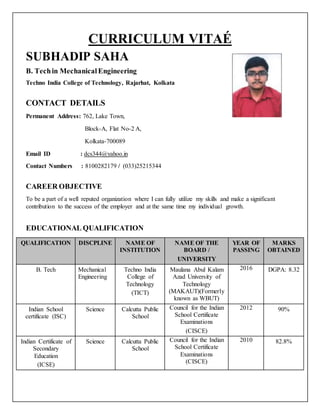 Subhadip Saha's curriculum vitae provides details of his educational qualifications, skills, vocational training, certifications, and personal details. He holds a B. Tech in Mechanical Engineering from Techno India College of Technology with a DGPA of 8.32. His skills include programming languages like C and Java, design software like AutoCAD and Creo, and office software. He has received vocational training in refrigeration, air conditioning, and AutoCAD. His hobbies include cooking, listening to music, and internet surfing.
