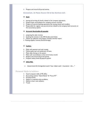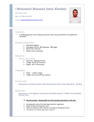 Mohamed Moawad Amin Khodair is seeking a challenging position where he can apply his accounting and personal skills. He has a bachelor's degree in accounting from Zagazig University in Egypt and is currently working as an accountant at Flame Source Oil & Gas Services LLC in Abu Dhabi, UAE. His previous experience includes working as an accountant and site accountant at The Egyptian Company for Solid Waste Recycle, where he performed accounting operations, payroll, and customer follow-up.