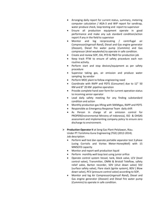This curriculum vitae outlines the qualifications and experience of Tahan David Parasian Manullang. He has over 8 years of experience in oil and gas operations, currently working as a Production Operator I. His roles have included monitoring equipment, ensuring safe operations, and leading safety meetings. He holds a Diploma III in Mechanical Engineering and has extensive training in areas such as ISO standards, air emission control, and compressor operation and maintenance.