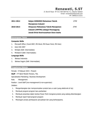 CV ini berisi informasi pribadi, pendidikan, pelatihan, organisasi, keterampilan teknis, dan pengalaman kerja Renawati. Ia lulusan Sekolah Tinggi Manajemen Industri Cempaka Putih tahun 2014 dan saat ini bekerja sebagai staff pemasaran di Bank Mandiri.
