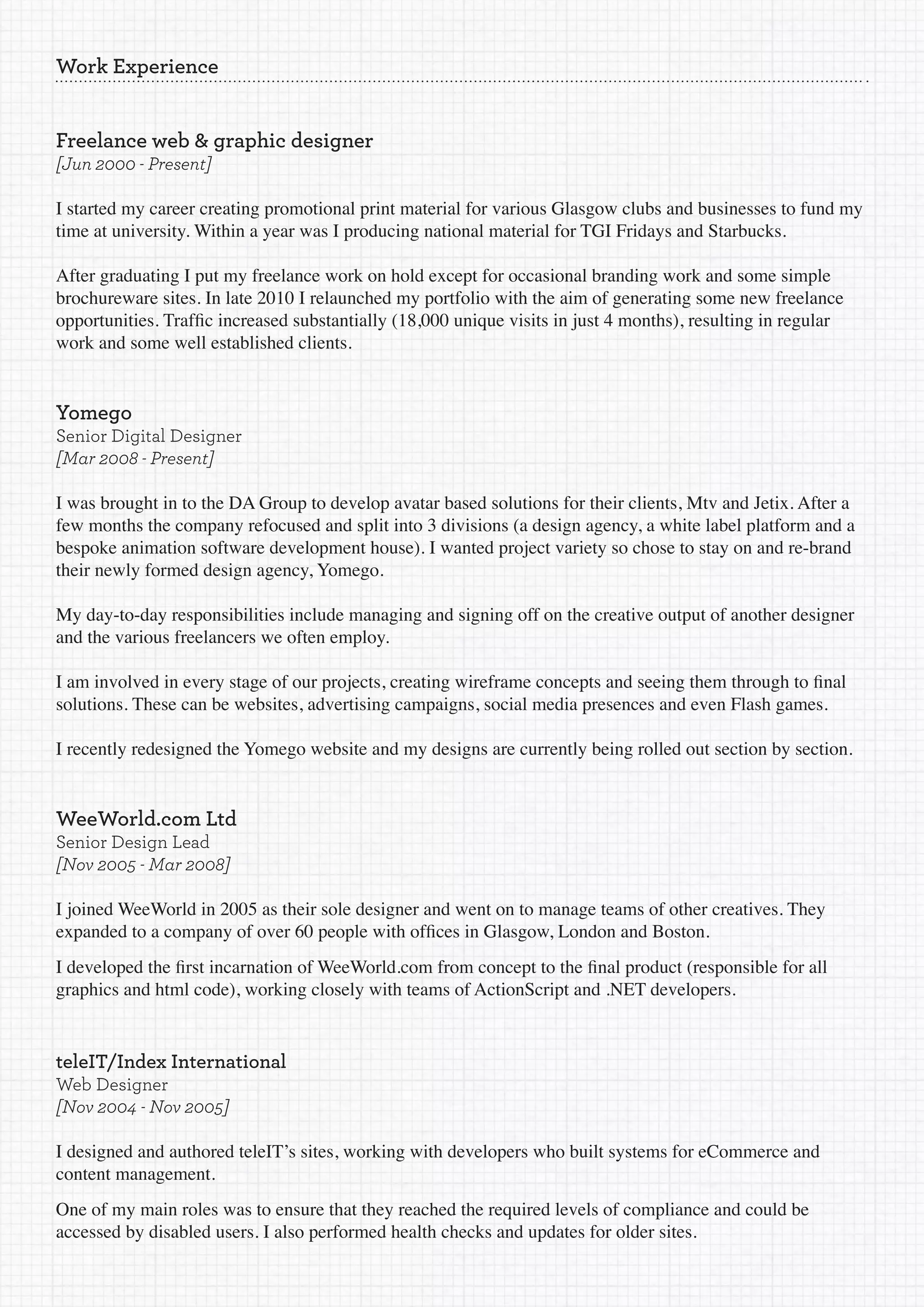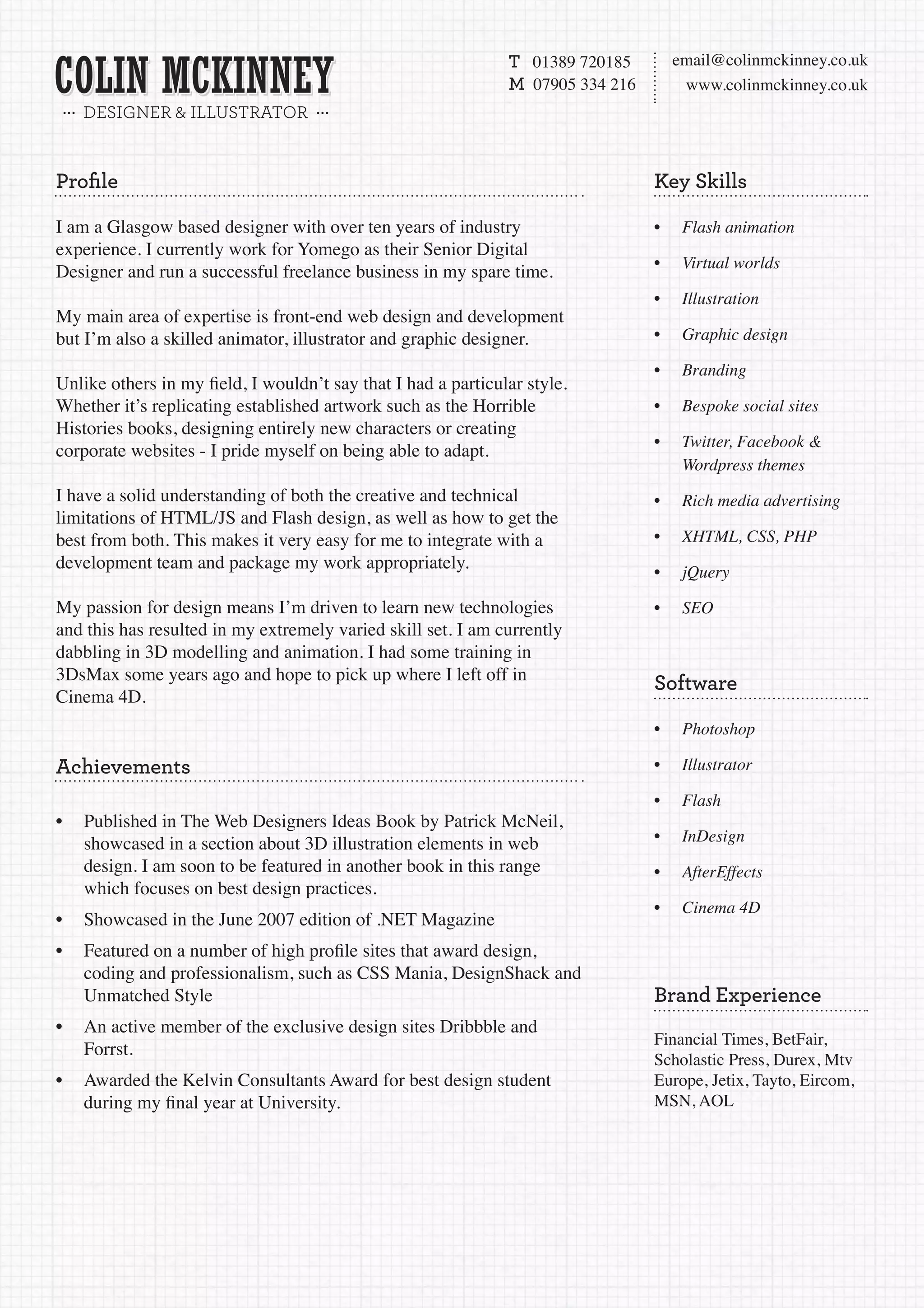Colin McKinney is a Glasgow-based designer with over 10 years of experience in web design, animation, illustration, and graphic design. He currently works as a Senior Digital Designer for Yomego, where he manages projects from concept to completion. Colin has expertise in technologies like Flash, HTML/CSS, and Cinema 4D. He is passionate about design and dedicated to learning new skills. Some of Colin's past clients include Financial Times, MTV, and Jetix.