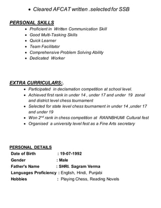 Abhishek Verma is seeking a career opportunity where he can continuously learn and grow intellectually. He has a B.Tech in Electronics and Communication from Punjabi University with 61% marks from 2015. He has completed training at HCL Patiala on microcontrollers and at Delhi Transco Ltd on Supervisory Control and Data Acquisition. He has cleared the Combined Defence Services SSB and AFCAT written exams. His personal skills include strong written communication, multi-tasking, being a quick learner, team facilitation, and problem solving. He enjoys playing chess, reading novels, and has participated in several chess tournaments winning various ranks.