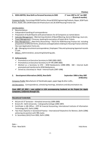 Indu Arora has over 20 years of experience in secretarial and internal audit roles. She currently works as a Personal Assistant for JK Tyre & Industries Ltd., where her responsibilities include documentation for audit reports, maintaining records, and preparing presentations for management and the Audit Committee. Previously, she worked for DCM Limited for nearly 10 years, where she took on roles with increasing responsibility, eventually becoming Executive Secretary to the CMD and VP-HR. She holds an M.Com degree and diplomas in secretarial practice and IT applications.
