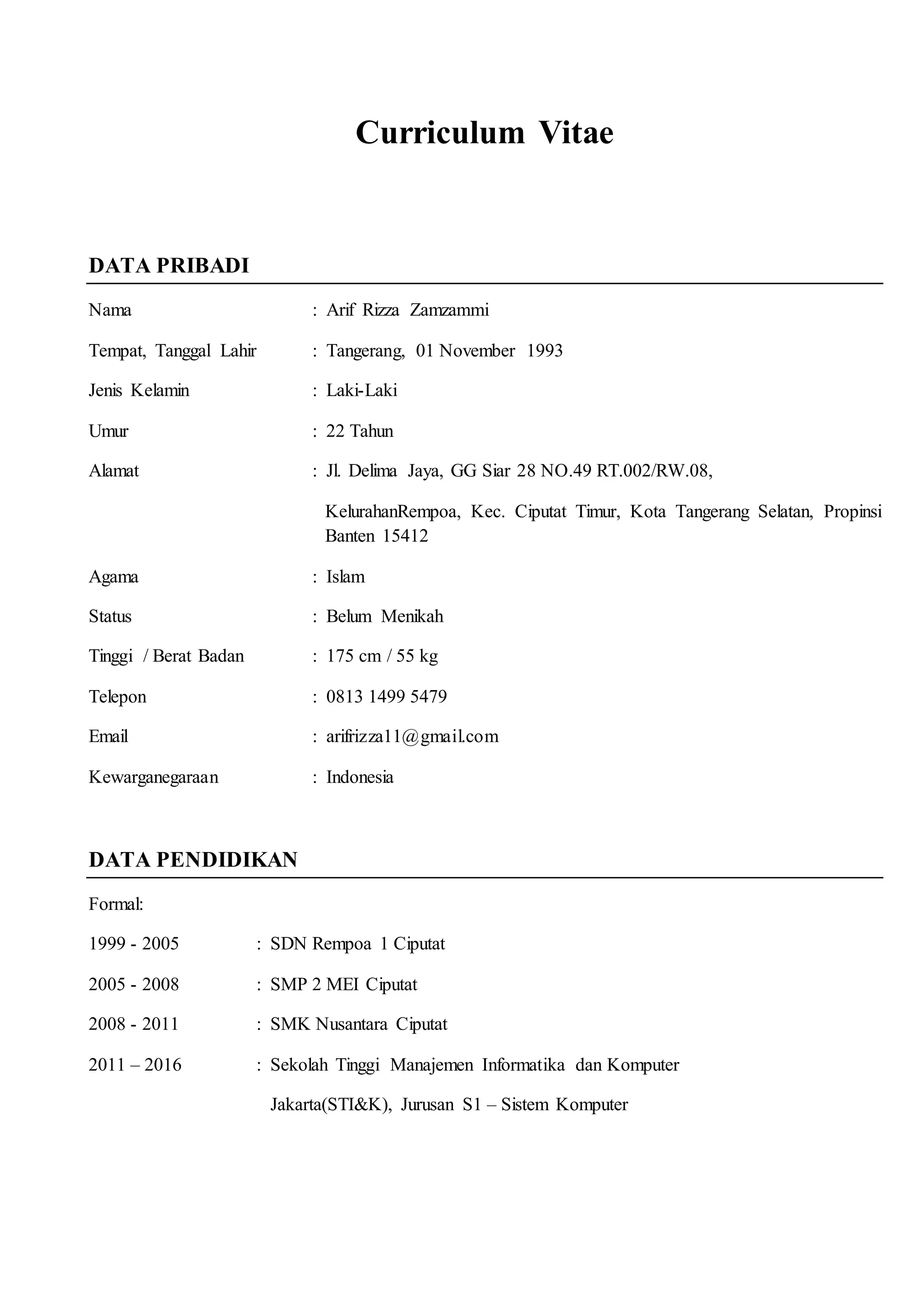 Curriculum vitae ini milik Arif Rizza Zamzammi, seorang pria kelahiran Tangerang pada 1 November 1993, berdomisili di Tangerang Selatan, dengan pendidikan terakhir S1 Sistem Komputer di STIMIK Jakarta. Di samping pendidikan formal, Arif juga memiliki pelatihan non-formal dan pengalaman kerja sebagai asisten laboratorium dan helper chef. CV ini disusun dengan harapan dapat digunakan dengan baik.