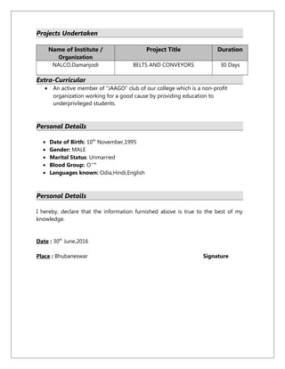 Sailendranath Mohanaty is seeking a position that allows him to enhance his mechanical engineering skills and knowledge. He received a B.Tech in Mechanical Engineering from ITER Siksha 'O' Anusandhan University in 2017 with a 7.5 CGPA. His interests include automobiles, internal combustion engines, and computer programming languages like C, C++, and CATIA. He has undertaken projects in belts and conveyors at NALCO and received CATIA training at CTTC Bhubaneswar.