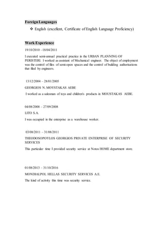 Konstantinos Antonopoulos provides his CV including personal information such as name, date and place of birth, contact information, education history, work experience, foreign language skills, and additional training. He has a degree in Mechanical Engineering and teaches various engineering and computer courses. His work experience includes positions in urban planning, toy sales, warehouse work, and security services. He also lists English language proficiency and certifications in areas such as ECDL, vehicle operation, and online marketing fundamentals.