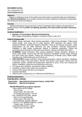 Muhammed Suhail is a mechanical engineer with over 5 years of experience in design and supervision of HVAC, fire fighting, plumbing, and other mechanical services for buildings. He holds a Bachelor of Technology degree in Mechanical Engineering. Some of his major projects include the Baylasun Hotel, Al Thuraya College, and the Faculty of Marine Science. He is seeking a challenging career where he can utilize his technical skills and qualifications.
