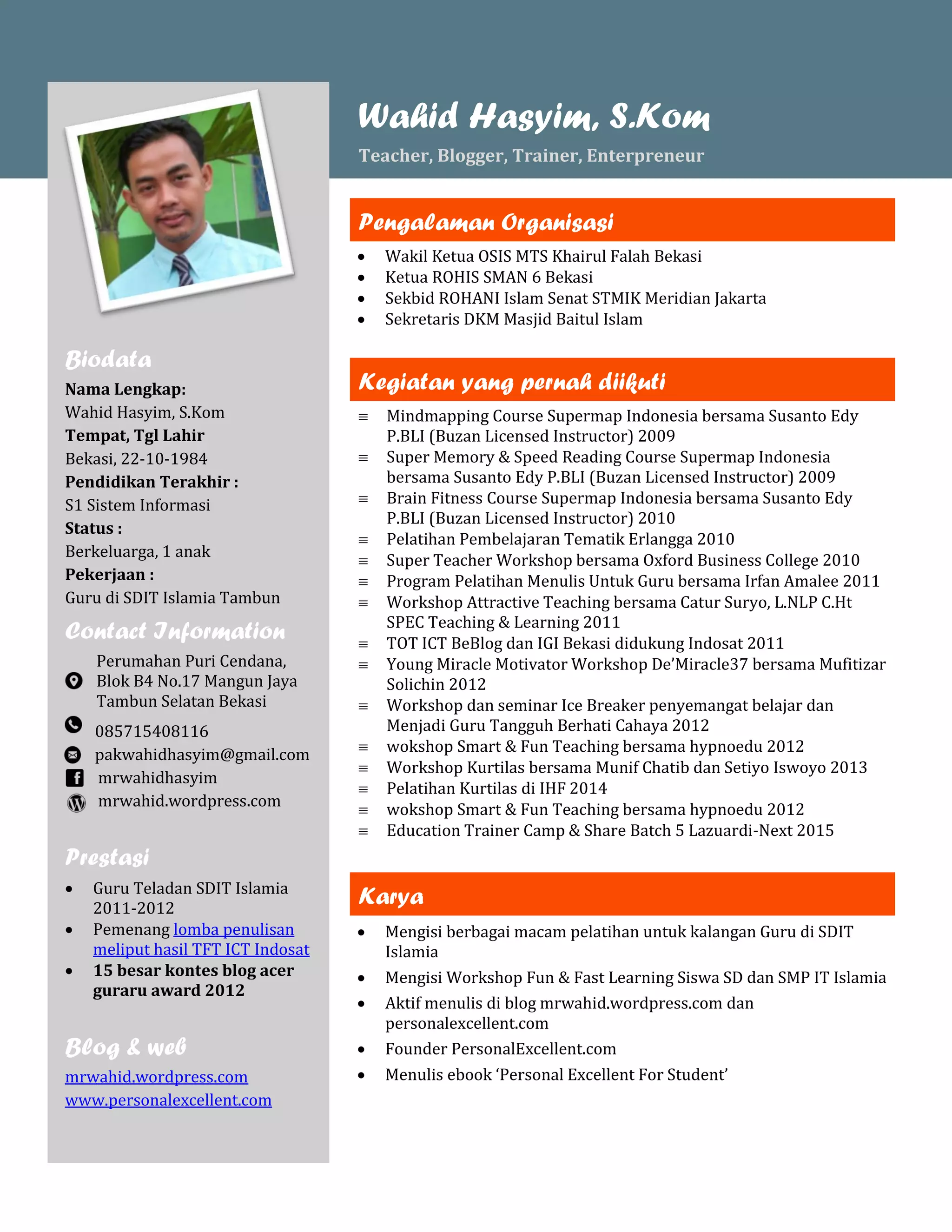 Biodata Wahid Hasyim, S.Kom, lahir di Bekasi pada 1984. Beliau adalah guru di SDIT Islamia Tambun yang telah mengikuti berbagai pelatihan kependidikan dan memiliki prestasi sebagai guru teladan serta pemenang lomba penulisan. Beliau juga aktif sebagai blogger dan penulis e-book.