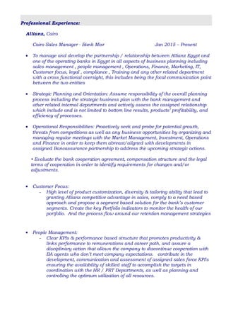 This document contains the resume of Tarek Fawzy Mohamed El-Kholy. It provides his contact information, personal details like date of birth and marital status, skills in languages and computer programs, professional training courses, work experience including his current role as Cairo Sales Manager at Allianz Egypt, achievements and awards, education qualifications, and hobbies.
