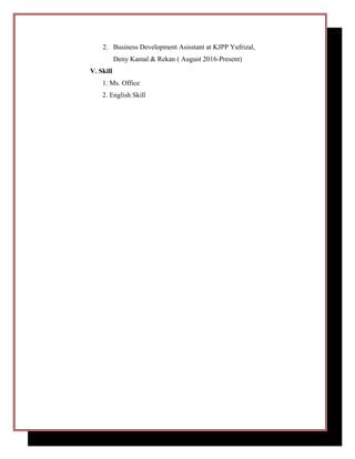 This curriculum vitae outlines the personal and educational background of Reza Samantha. It includes his full name, date and place of birth, gender, address, phone number, marital status, religion, formal education history from 2007-2013 at the University of Prof. Dr. Moestopo Jakarta and from 2004-2007 at SMUN 107 high school. It also lists his informal English education and work experience as an After Sales Assistant at Carmudi Indonesia from 2014-2016 and current role as a Business Development Assistant at KJPP Yufrizal, Deny Kamal & Rekan since 2016.