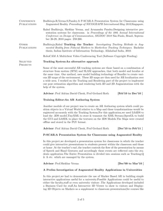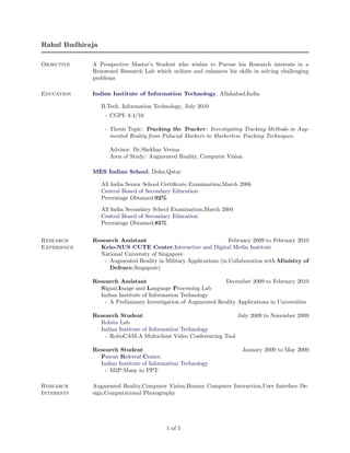 Rahul Budhiraja seeks to pursue a Master's degree to further his research interests in augmented reality, computer vision, and human-computer interaction. He holds a B.Tech in Information Technology from IIIT Allahabad with a CGPI of 8.4/10 and conducted his thesis on tracking methods in augmented reality. His research experience includes projects in augmented reality applications for the military and universities. He is skilled in programming languages like C, C++, and ActionScript and 3D software like Blender and Poser Pro.