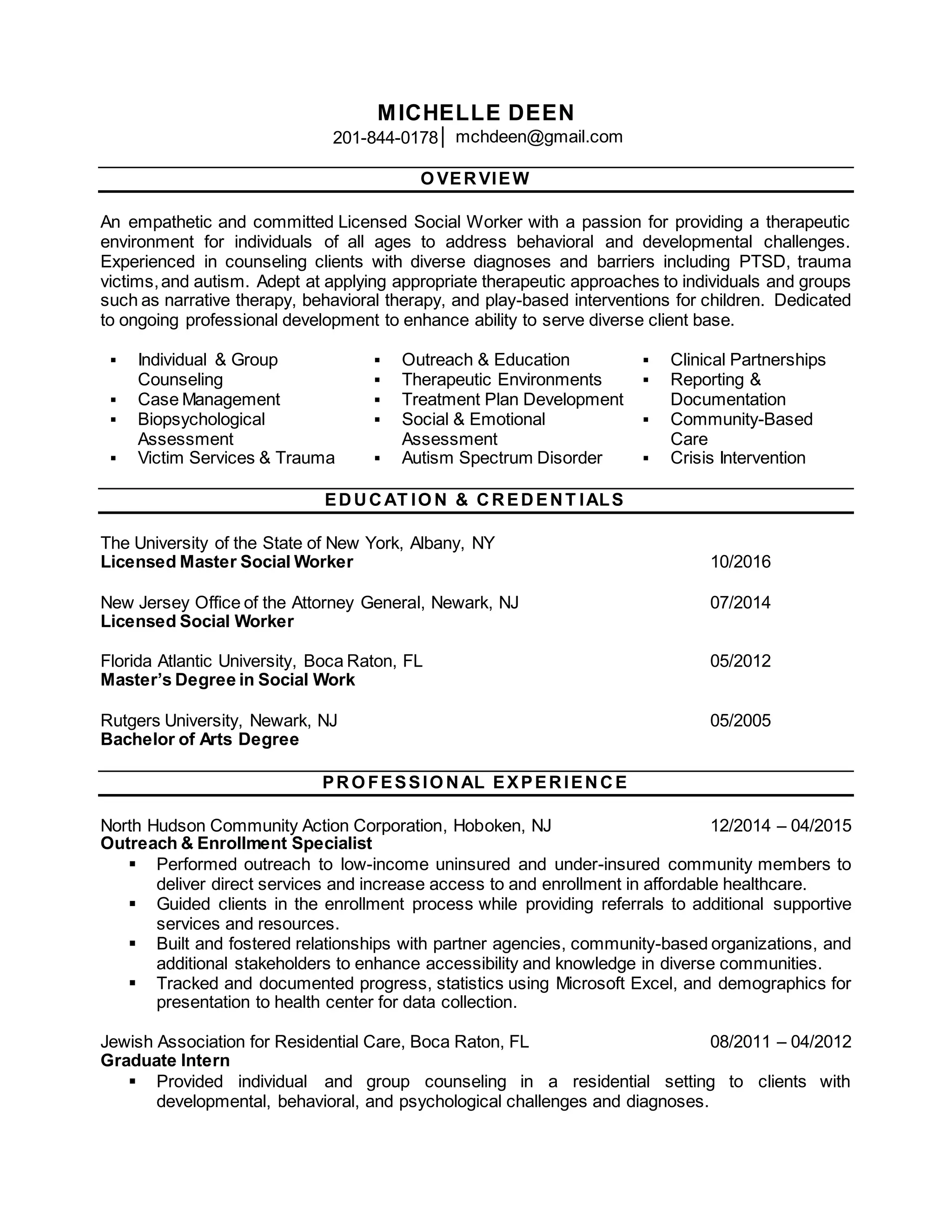 Michelle Deen is a licensed social worker with over 10 years of experience providing individual and group counseling. She has expertise in areas such as PTSD, trauma, autism spectrum disorder, and behavioral/developmental challenges. Her experience includes work with diverse client populations through positions at community organizations, hospitals, and as a graduate intern. She is adept at applying therapeutic approaches like narrative therapy and cognitive behavioral therapy. Michelle is also dedicated to ongoing professional development and community engagement.