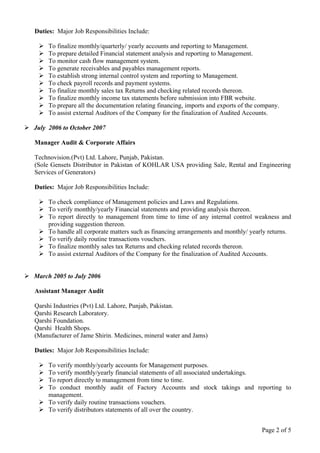 The document outlines the professional experience and qualifications of Muhammad Nauman Yousaf, including his employment history working in finance and audit roles for various companies in Pakistan from 1999 to present, and his academic background including a B.Com degree from the University of the Punjab. It provides details on his roles and responsibilities in positions like Manager Finance, Manager Audit & Corporate Affairs, and Assistant Manager Audit. The document also lists his professional designations and memberships as well as computer skills.