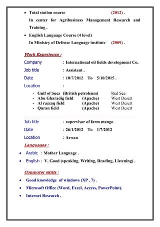 Adham Attia Mohamed Aly is seeking a career to apply his educational background in international marketing from the Higher Institute of Agricultural cooperation. He has experience as an assistant at International oil fields development Co. in Gulf of Suez and West Desert from 2012-2015, and as a supervisor of a mango farm in Aswan from 2012. He is proficient in English, Windows, Microsoft Office, and has training in green roofs, landscaping, safety courses, and total station.