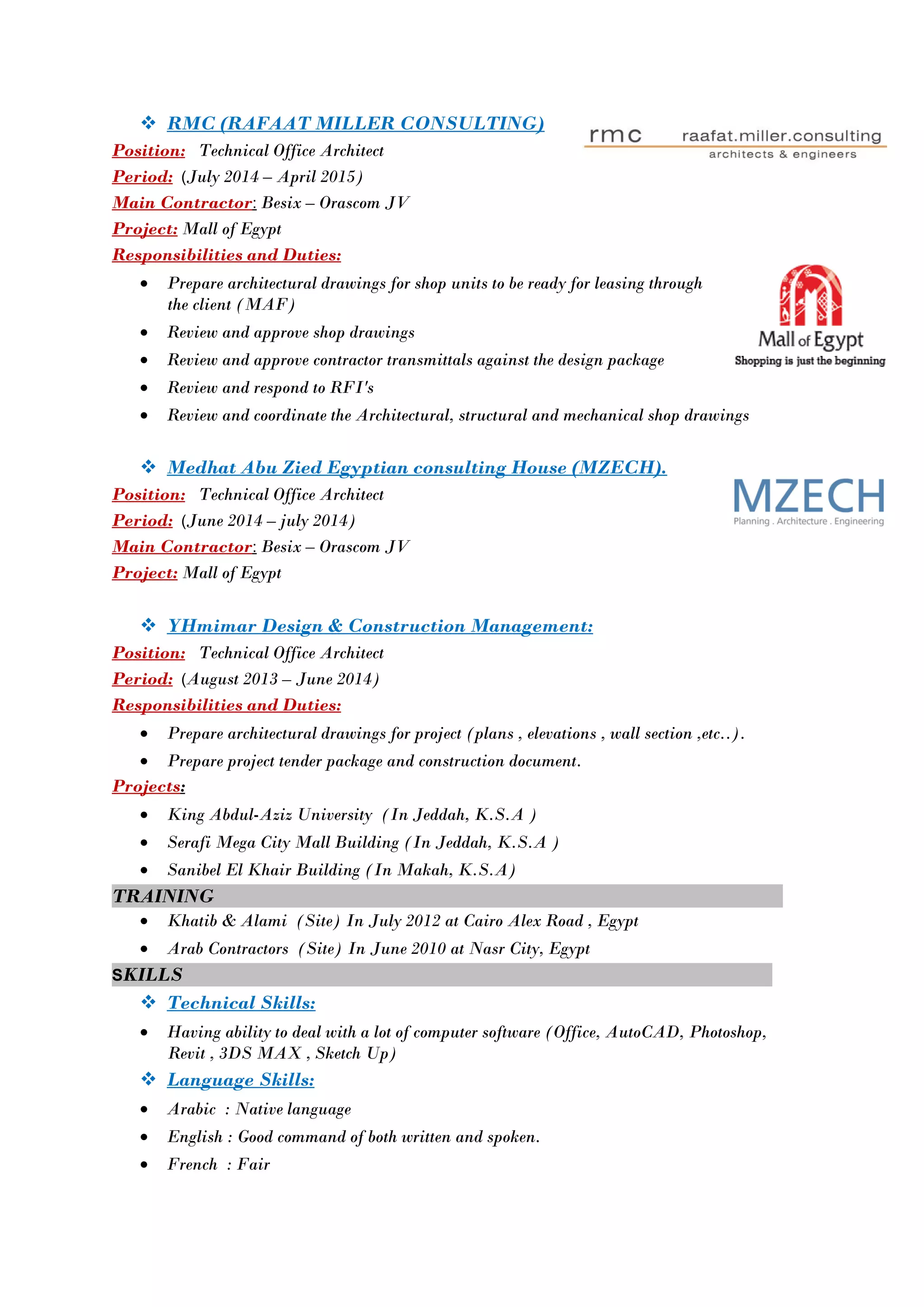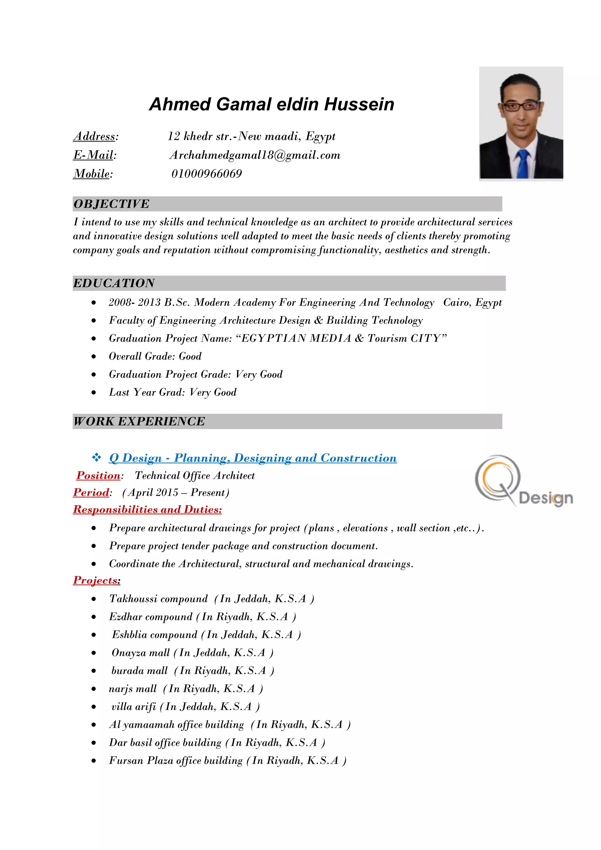 Ahmed Gamal eldin Hussein is an architect seeking new opportunities. He has over 5 years of experience working on projects in Egypt and Saudi Arabia at various firms. His experience includes preparing architectural drawings, construction documents, and coordinating project teams. He holds a B.Sc. in architecture from Modern Academy For Engineering And Technology Cairo, Egypt.