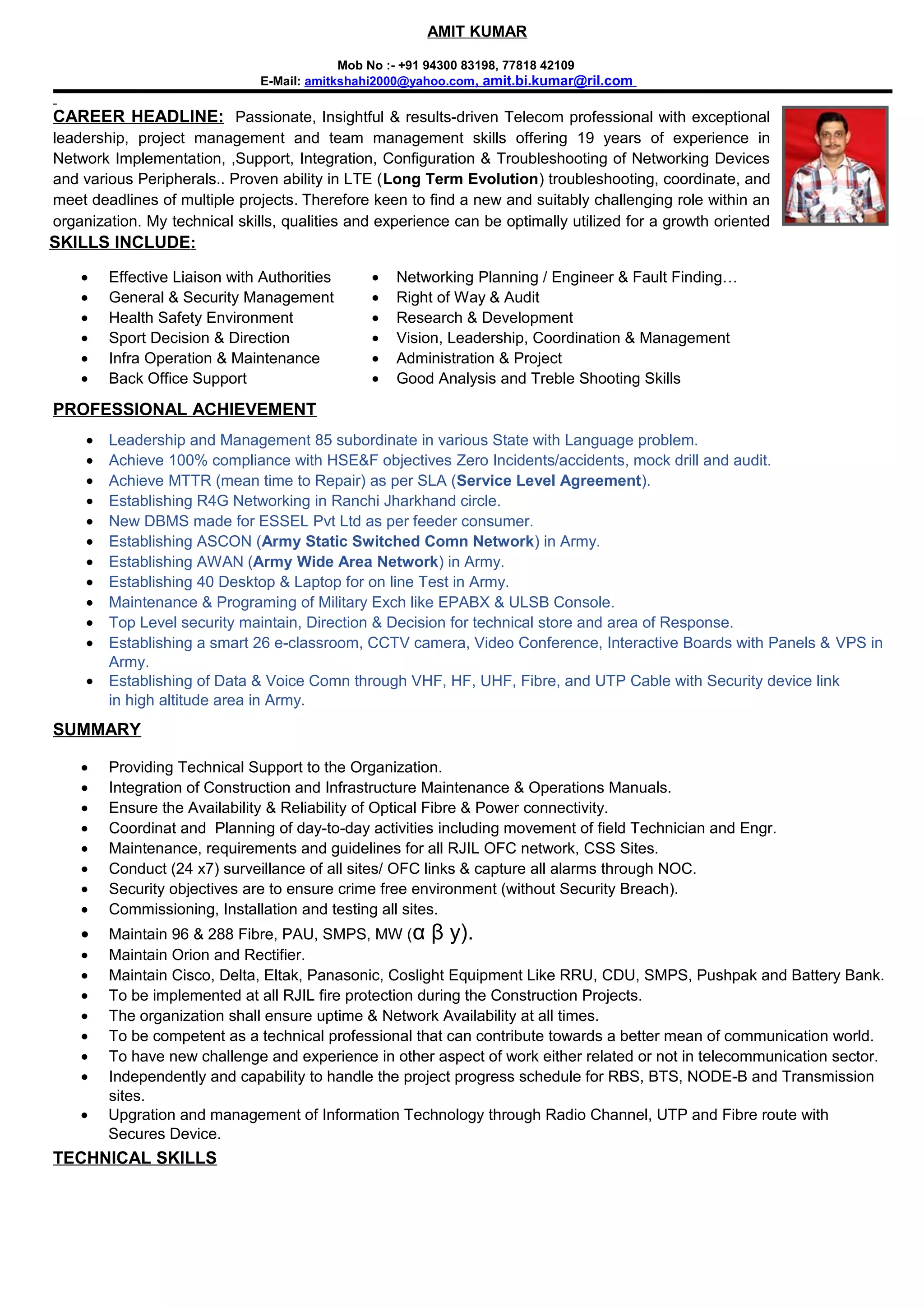- Amit Kumar is a telecom professional with 19 years of experience in network implementation, support, integration, configuration, and troubleshooting. He seeks a new challenging role to utilize his skills.