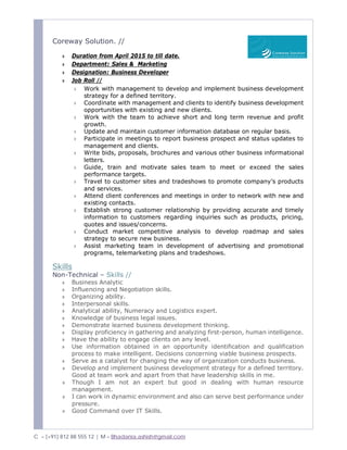 The document is a detailed curriculum vitae of Ashishkumar Bhadania, showcasing his career objectives, education, and professional experience in customer service, business development, and technical support. It highlights his work history with Tata Tele-services and Coreway Solutions, emphasizing his skills in team coordination, business strategy, and customer relationship management. Additional information includes technical skills, training, projects, and personal details such as hobbies and language proficiency.