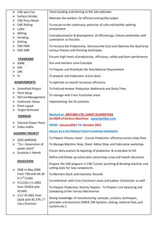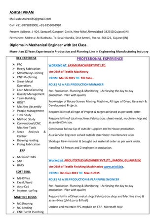 This document contains the resume of Ashish Virani. He has over 12 years of experience in production and planning roles in engineering manufacturing industries. He holds a Diploma in Mechanical Engineering and has expertise in areas such as production planning and control, CNC machining, quality management, and people management. Currently, he works as an Assistant Production Manager at Laxmi Machinery Pvt. Ltd., where he is responsible for pre-production planning and monitoring. Previously he has worked at Arioli Textiles Machinery Pvt. Ltd. and Batliboi Ltd. in senior production and planning roles.
