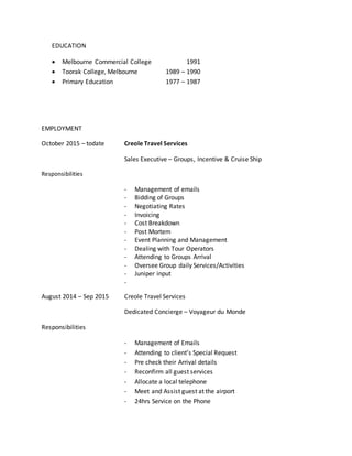 Audrey Roberts is a Seychelloise national with over 25 years of experience in the travel and tourism industry. She holds various qualifications related to travel, tourism, and business administration. Her work experience includes roles in sales, customer service, and event coordination for organizations like Creole Travel Services, Seychelles Tourism Board, Air Seychelles, and British Airways. She is proficient in English, French, and Creole and has excellent computer skills.
