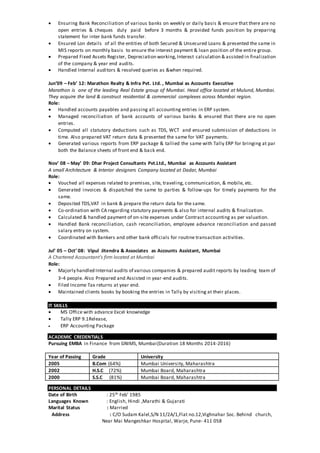 Avani Gaurav Gaglani is a finance professional pursuing an EMBA with over 9 years of experience in finance and accounts across industries like real estate and CA firms. She is currently seeking a challenging role in finance and accounts. Her experience includes roles at Tridhaatu Realty, Marathon Realty, and a CA firm where she handled accounts payable, statutory compliance, internal audits, and financial reporting. She has strong skills in expense management, MIS reporting, and compliance.