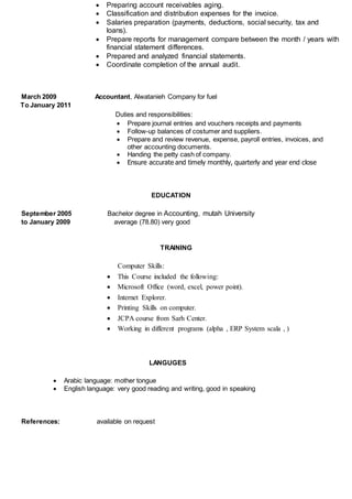 Bahaa alqashash has over 10 years of experience in accounting roles. He is currently the chief accountant at Siniora food industries, where he prepares financial statements, budgets, analyses, and reports. Previously, he worked as chief accountant at Alwatanieh Company for fuel from 2011 to 2014, and as an accountant there from 2009 to 2011, gaining experience in accounting entries, financial statement preparation, and audit coordination. He holds a bachelor's degree in accounting from mutah University and is proficient in Microsoft Office, accounting programs, and English.