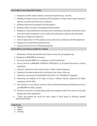 Mr. Bhavik Patel is seeking a position that provides challenging work and opportunities for growth. He has a Master's degree in Pharmacy and over 4 years of experience in quality assurance roles. His experience includes preparation of SOPs, change control, deviation handling, risk assessment, vendor qualification, and audit management. He is proficient in MS Office, SAP, and has strong communication, problem-solving, and leadership skills.