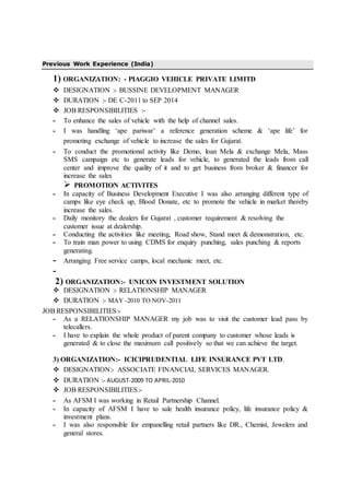 Bijander Singh Sandhu is a 31-year-old married male with over 8 years of work experience in sales and business development roles. He is currently working as a Mojo Territory Sales Manager for Mahindra Two Wheeler Ltd., where he is responsible for sales, service, enquiry generation, and managing dealer networks for their premium 300cc motorcycle. Previously, he held roles in sales, business development, and relationship management in India and the UK for companies such as Piaggio Vehicles, Unicon Investment Solutions, and ICICI Prudential Life Insurance. He has a science graduate degree and skills in communication, teamwork, and adapting to criticism.