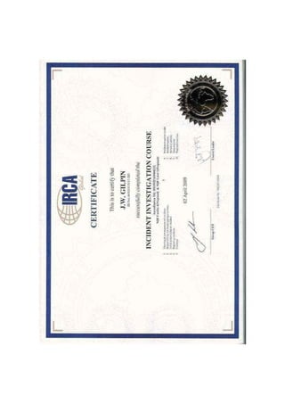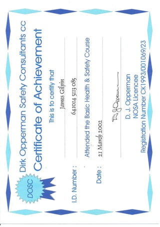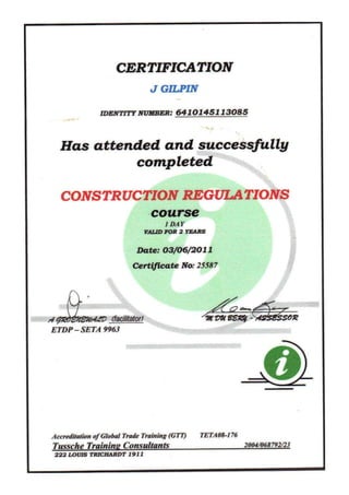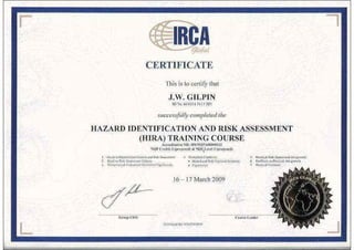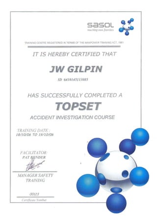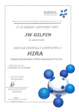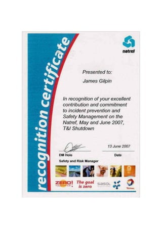 This document is a curriculum vitae for James William Gilpin that includes details about his identity, contact information, personal details, educational qualifications, professional affiliations and development, and career history working in safety, health, environment and risk roles over 10 years for various companies in South Africa. It provides information about his responsibilities, reports to, and reasons for leaving past positions.