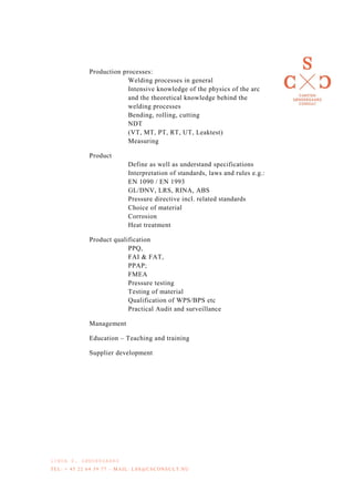 Linda S. Søndergaard is a 51-year-old welding and mechanical engineer with over 30 years of experience in welding engineering, production processes, quality assurance, and management. She has comprehensive knowledge of welding processes and qualifications in Lean, Six Sigma, and auditing. Her background includes roles at Siemens Wind Power, Force Technology, C&P Inspection, Alfa Laval, and other companies where she specialized in welding engineering, process improvement, and quality assurance.