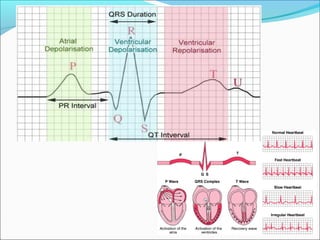 During exercise, the cardiovascular system responds to increase delivery of oxygen and nutrients to working muscles. The heart rate increases to pump more blood with each contraction. The left ventricle increases in size to pump more blood per beat, increasing stroke volume and cardiac output. Blood is redirected away from organs and toward active muscles and skin. Arrhythmias are disruptions to the heart's normal rhythm that can be benign or life-threatening depending on severity. The electrocardiogram monitors the heart's electrical activity through the cardiac cycle.
