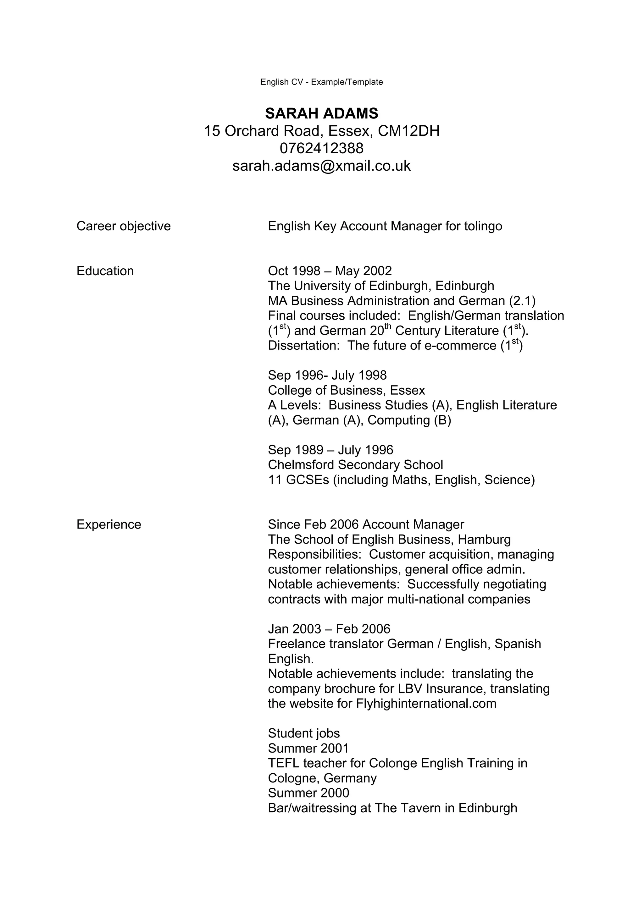 Sarah Adams is seeking a position as an English Key Account Manager for tolingo. She has a MA in Business Administration and German from the University of Edinburgh and over 10 years of experience in translation and customer relations work. Her skills include fluency in English, German and Spanish as well as computer proficiency and a passion for languages, travel, and staying up to date on translation tools and techniques.