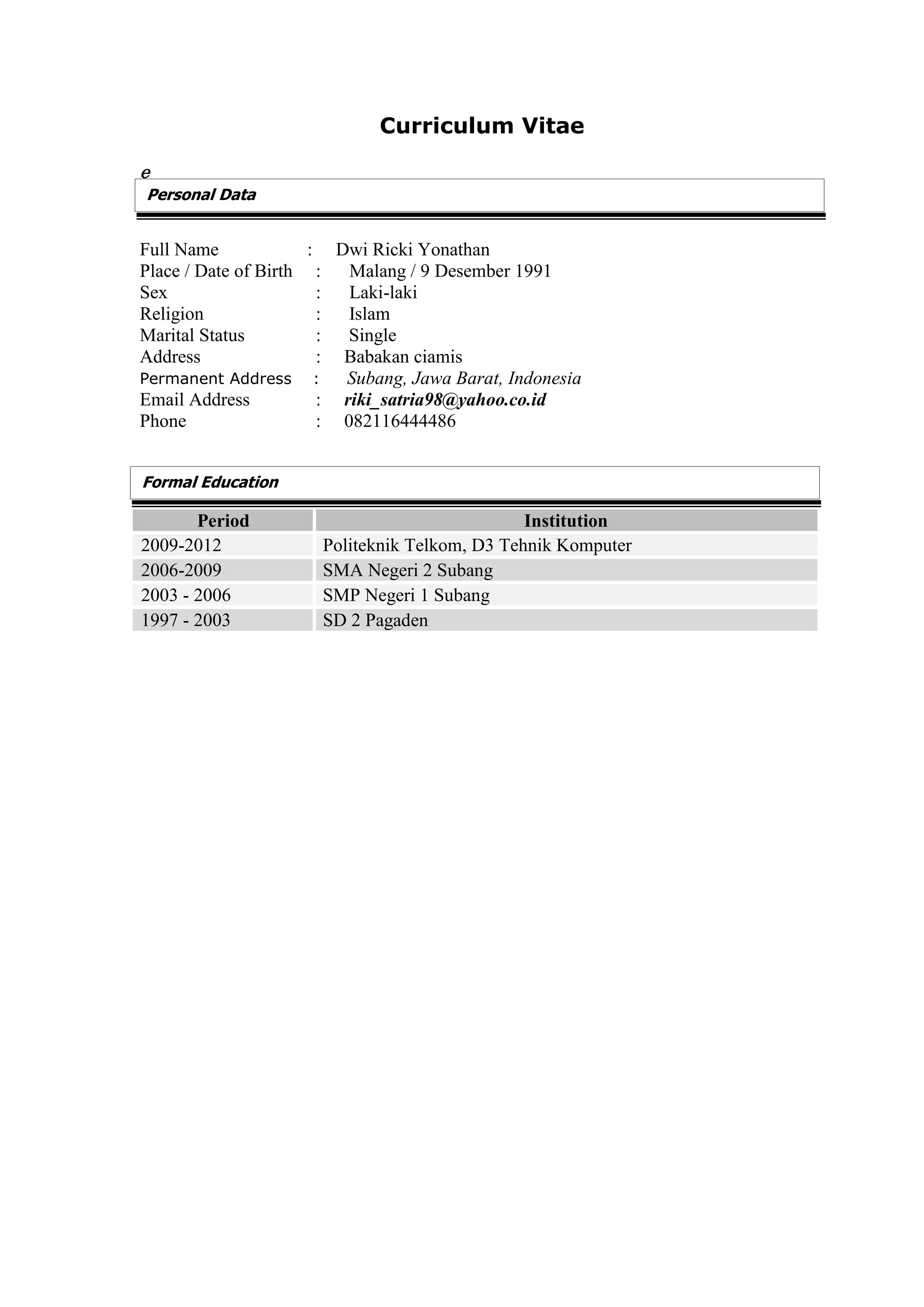 CV Dwi Ricki Yonathan yang berisi data pribadi, latar belakang pendidikan formal, dan pengalaman organisasi. Dwi lahir di Malang pada 1991, saat ini tinggal di Subang. Ia memiliki gelar D3 Teknik Komputer dari Politeknik Telkom dan pernah menjabat wakil ketua ekstrakurikuler catur serta bendahara OSIS selama masa sekolah.